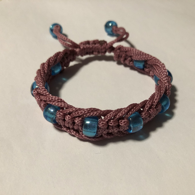 Nárameček je zdobený skleněnými korálky, obvod náramku je cca 19 cm, šíře 1,5 cm.