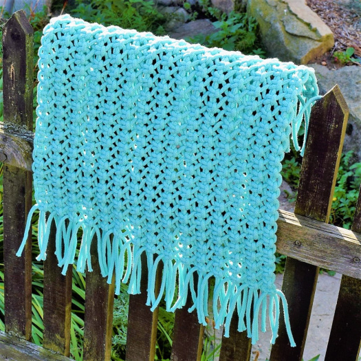 Kobereček v mentolové barvě, vyrobený technikou macramé, v Česku známá jako technika drhání, oblíbená v 70 letech opět stoupá na oblibě.