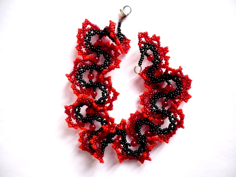 Ručně šitý náramek z rokajlových korálků Jablonex. Náramek je velmi pěkný, připomíná mořskou pěnu. Délka 21 cm. V náramku jsou rokajlové korálky a 6 mm skleněné korálky. Zapínání na karabinku z chirurgické oceli.