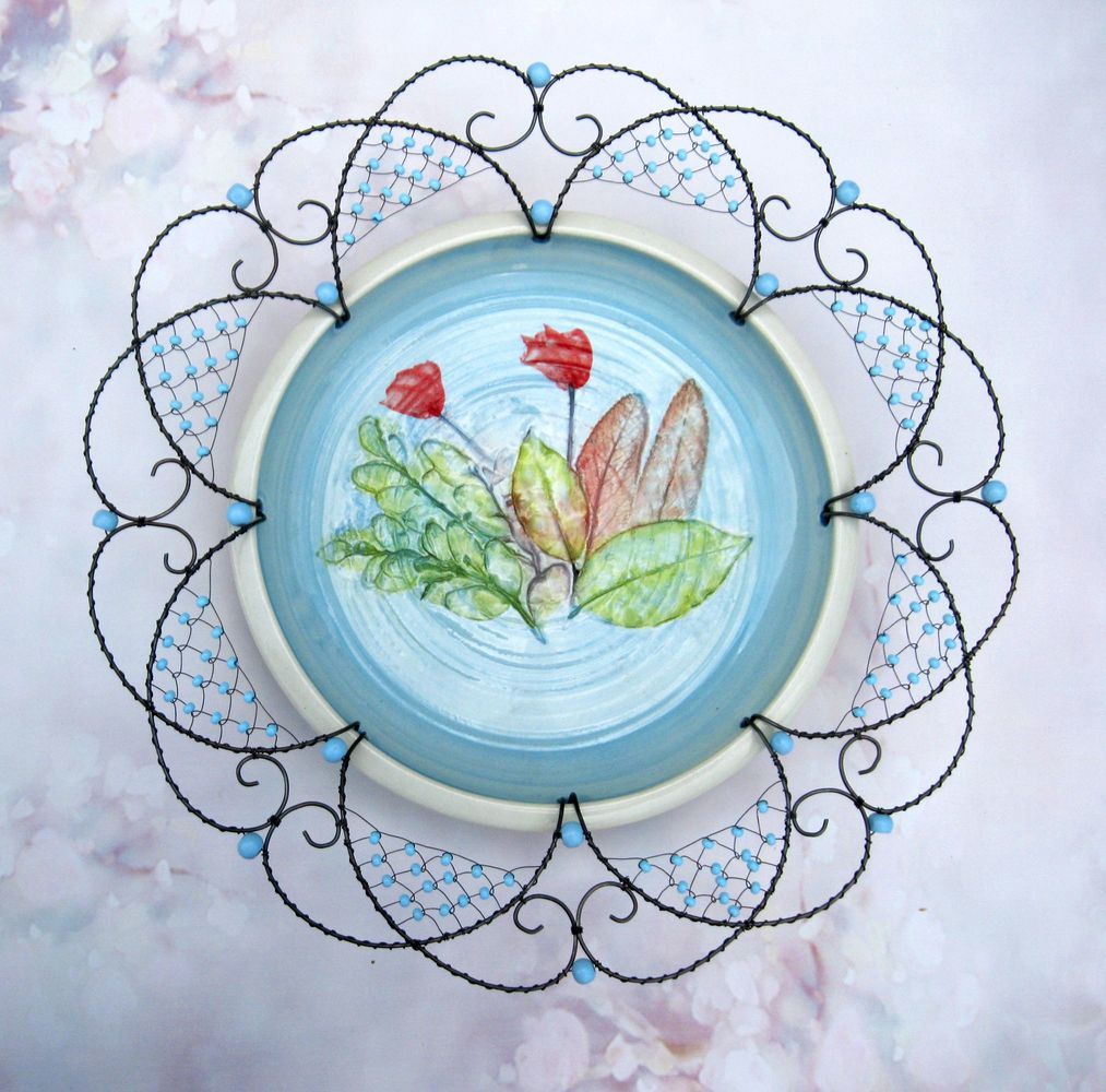 Keramická mísa v jemné blankytné barvě, bobatě zdobená jemným drátovaným opletem.