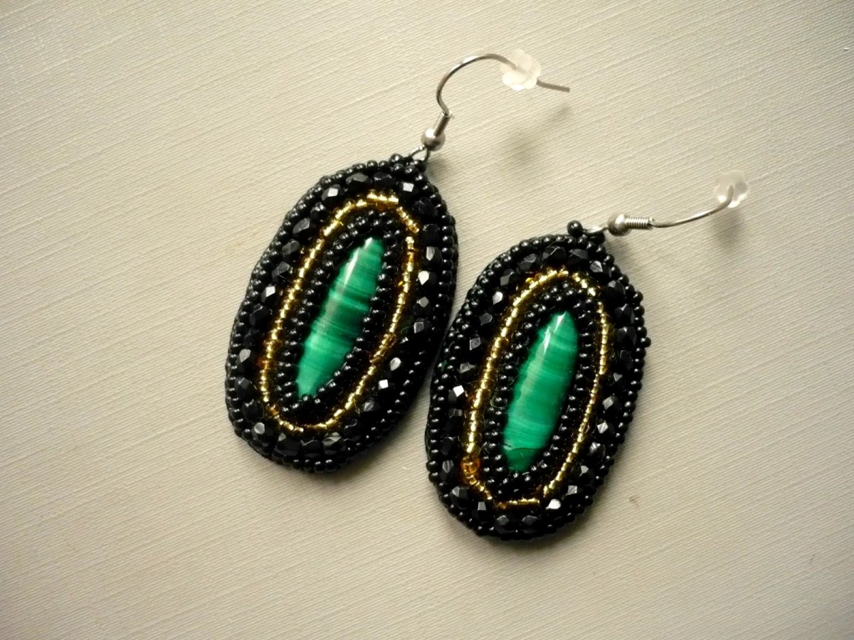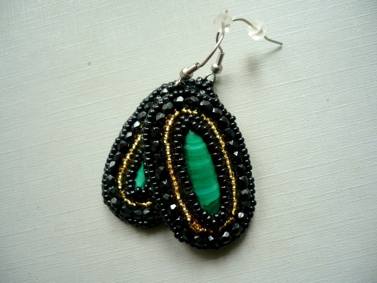 Ručně šité náušnice z rokajlu technikou beadweaving. Uprostřed je kabošon z malachitu. Vše podloženo tmavě zelenou plstí, doplněno skleněnými rokajlovými korálky, černými ohňovkami, zavěšeno na háčku z chirurgické oceli. Délka náušnic je 40 mm bez háčku.