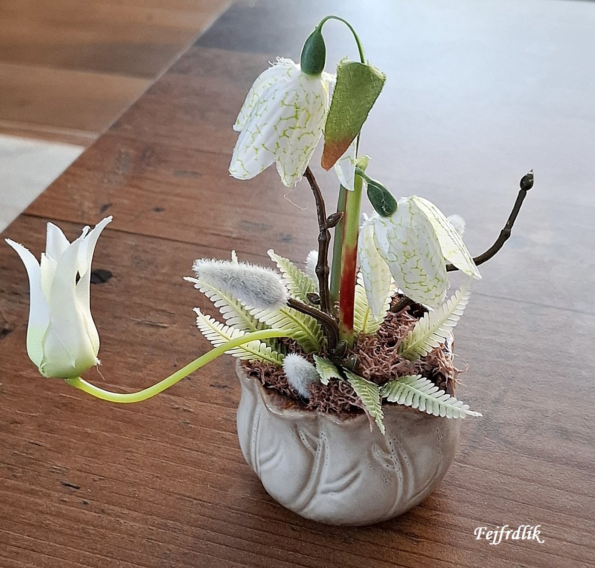 Malé jarní aranžmá v keramickém květináčku s látkovými květinami a umělou vrbovou větvičkou se zelení a islandským lišejníkem.