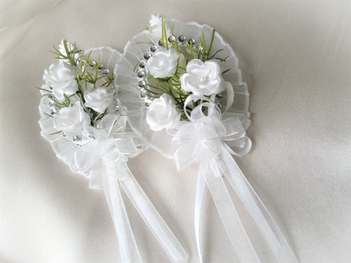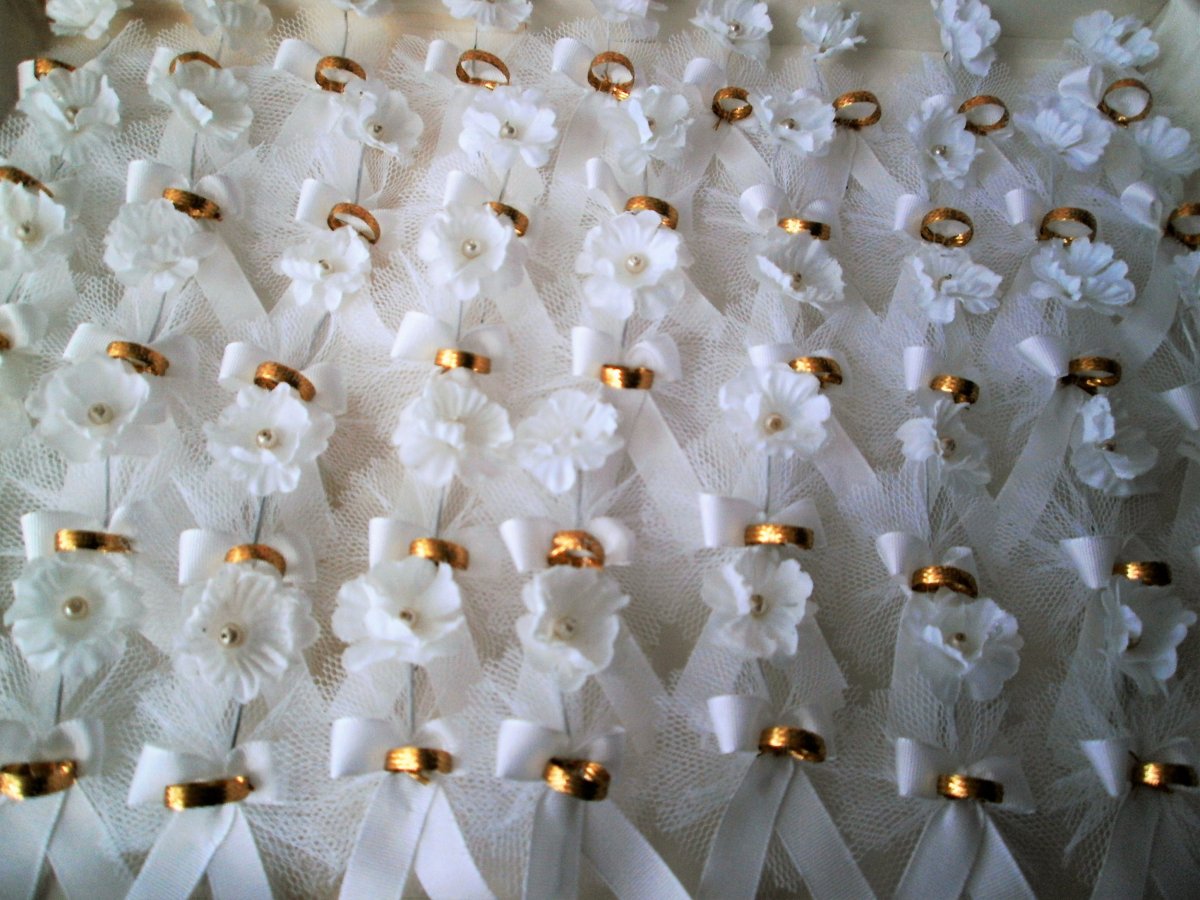 Pierko sa skladá z tylového krúžku o priemere 4,5cm,na ktorom je mašlička s bielym kvietkom a s hrubou zlatou obrúčkou. Je určené pre svadobných hostí. Pekne vynikne aj ako ozdoba na svadobné pozvánky, či ozdoba na salvetky, a i.