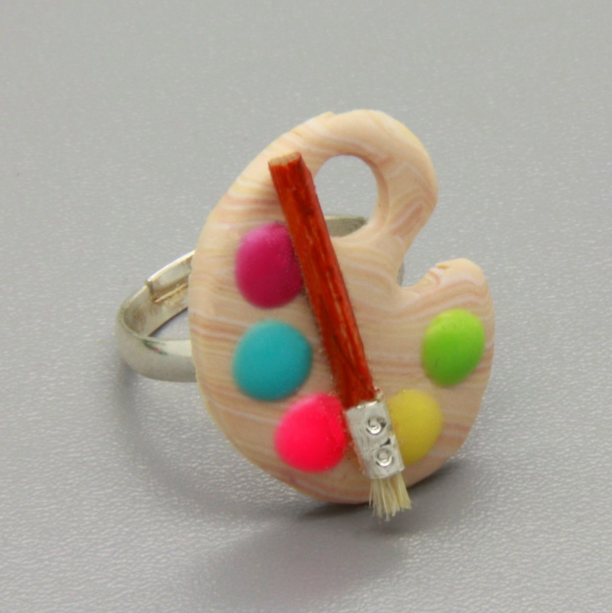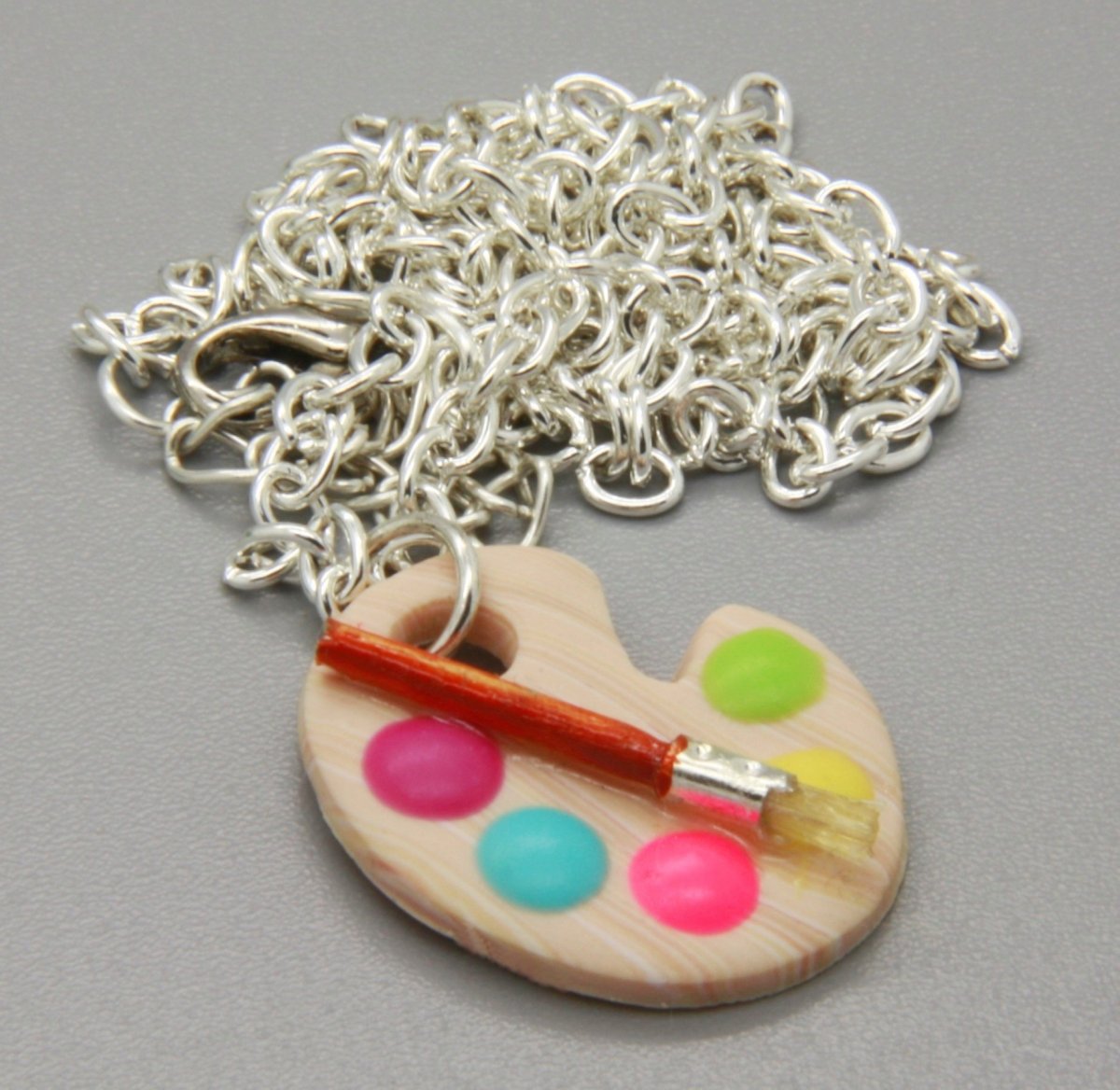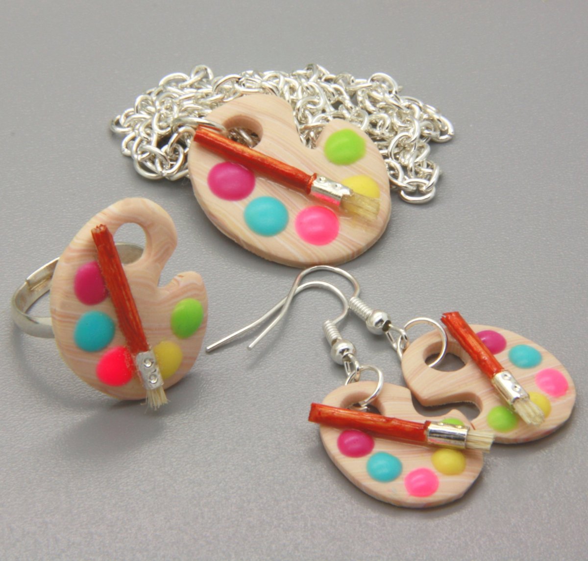 šperky z polymerové hmoty ve tvaru malířských palet s barvami a miniaturními štětci, určitě vhodné i jako dárek,