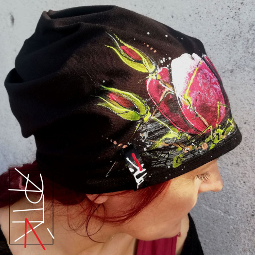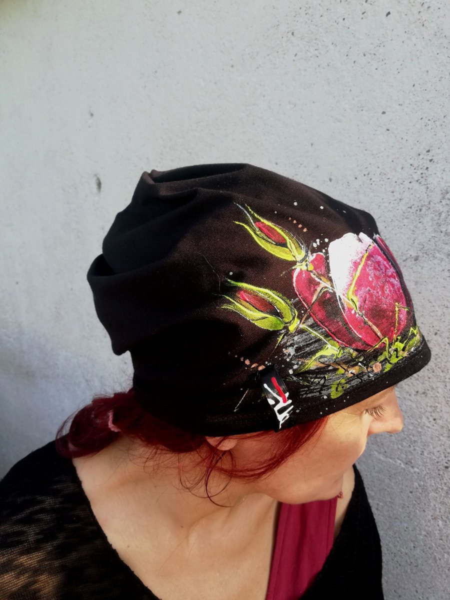 Bavlněné čepice, ručně malované... nemám ráda čepice, které jsou na hlavě upláclé, prot jsou všechny volné do výšky i šířky, vzadu se ohrnují, podkasají v pevné čássti u hlavy
