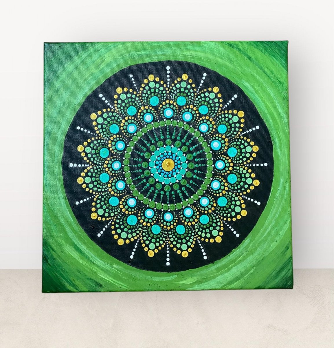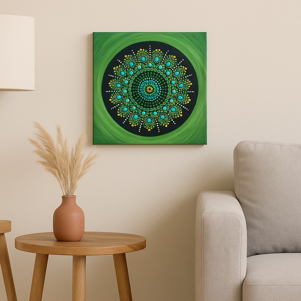 Převažující zelené tóny podporují harmonii, nalezení vnitřního klidu a rovnováhy. Doplňující zlatá barva zaručuje kouzelné odlesky. Svým provedením tak může mandala originální doplnit i vánoční atmosféru.