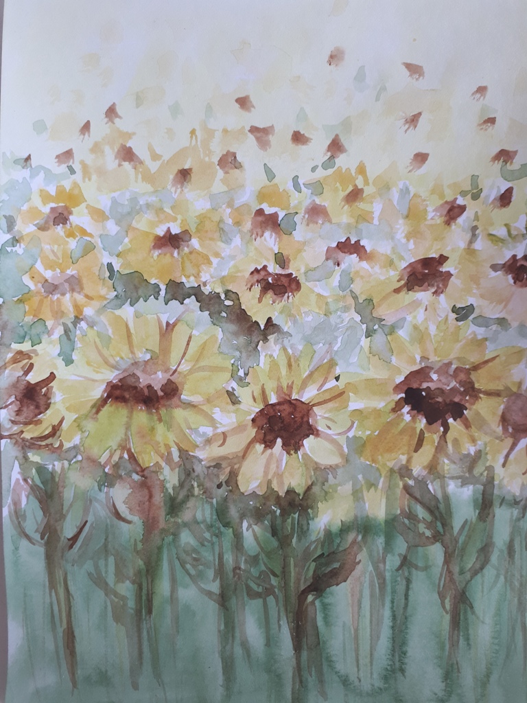 Ručně malované lněné šaty s motivem slunečnicového pole.