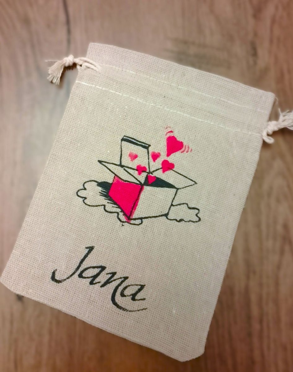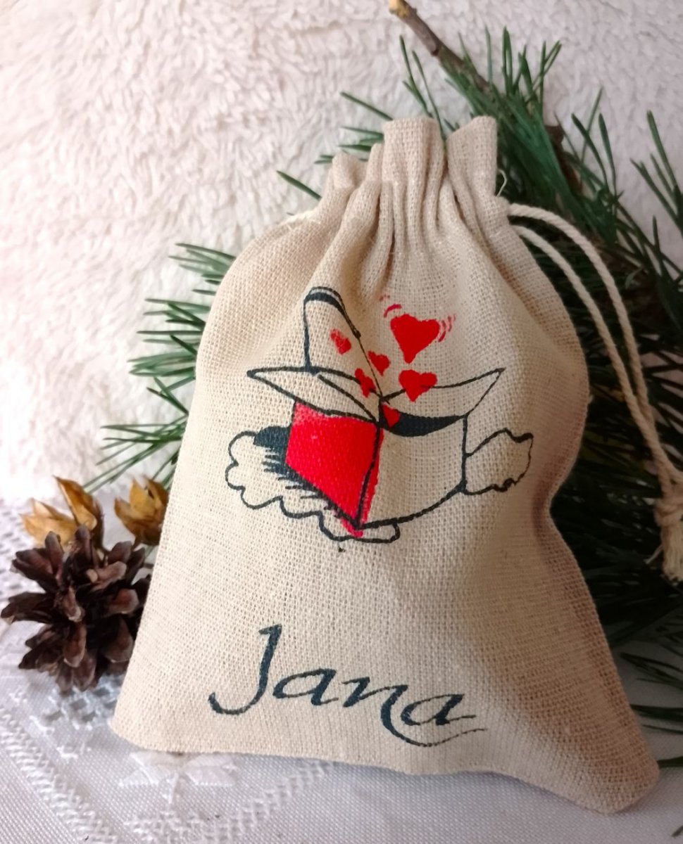 Originální lněný dárkový pytlík s křestním jménem Jana a obrázkem, který symbolizuje jeho význam.