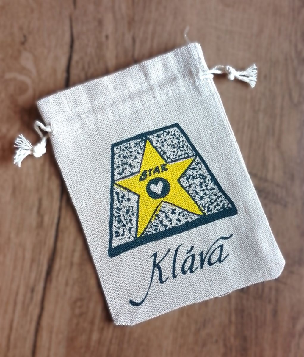 Originální lněný dárkový pytlík s křestním jménem Klára a obrázkem, který symbolizuje jeho význam.