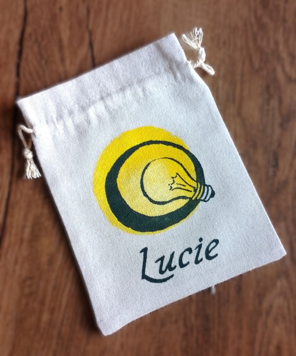 Originální lněný dárkový pytlík s křestním jménem Lucie a obrázkem, který symbolizuje jeho význam.