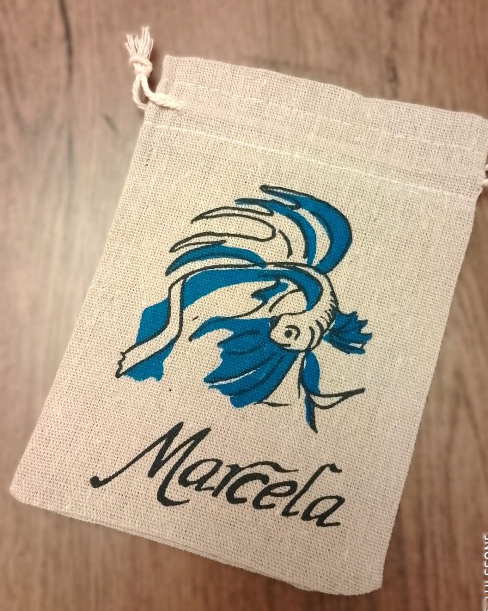 Originální lněný dárkový pytlík s křestním jménem Marcela a obrázkem, který symbolizuje jeho význam.
