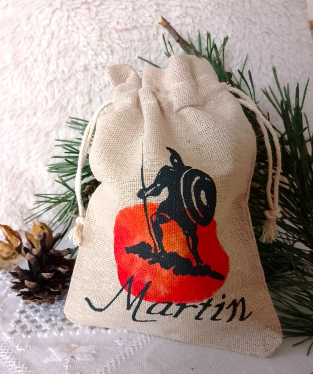Originální lněný dárkový pytlík s křestním jménem Martin a obrázkem, který symbolizuje jeho význam.