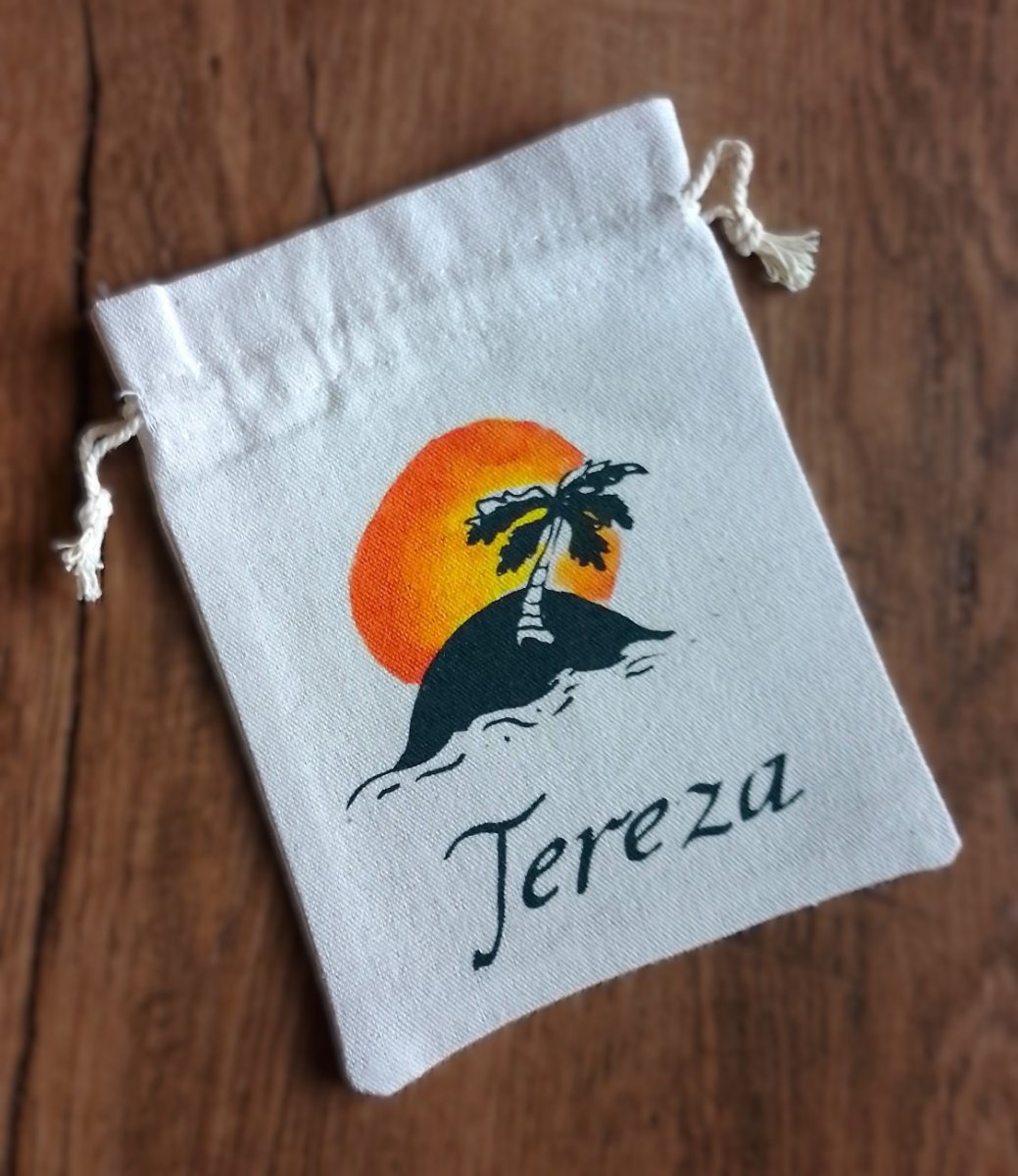 Originální lněný dárkový pytlík s křestním jménem Tereza a obrázkem, který symbolizuje jeho význam.