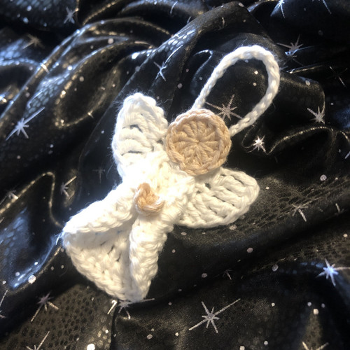 Háčkovaný anděl z bavlněné příze, určený k zavěšení, na ozdobu dárkové tašky a tak podobně. Každý kus je originál, každý další se může malinko lišit od hlavní fotografie.