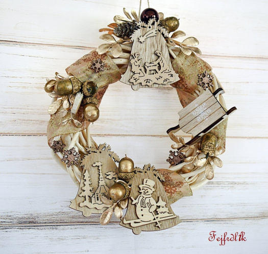 Vánoční věneček v přírodních barvách omotaný ozdobnou stuhou s vánočním motivem s dřevěnými komponenty, zlacenými žaludy.