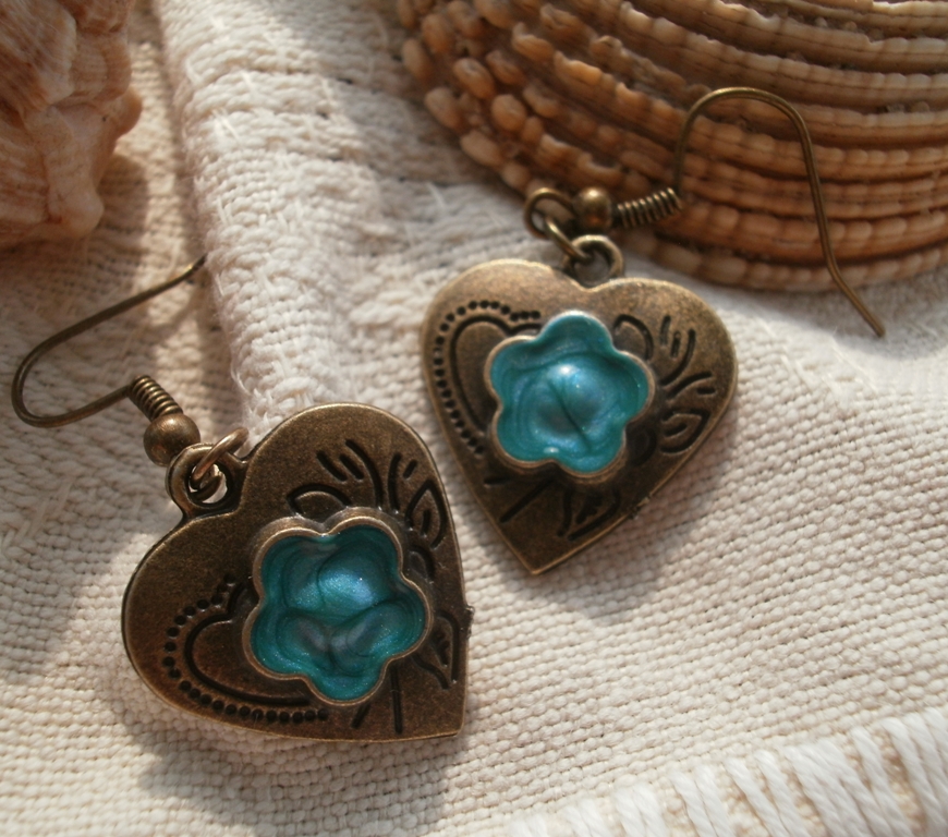 Náušnice ve tvaru srdce s tyrkysovou kyti.