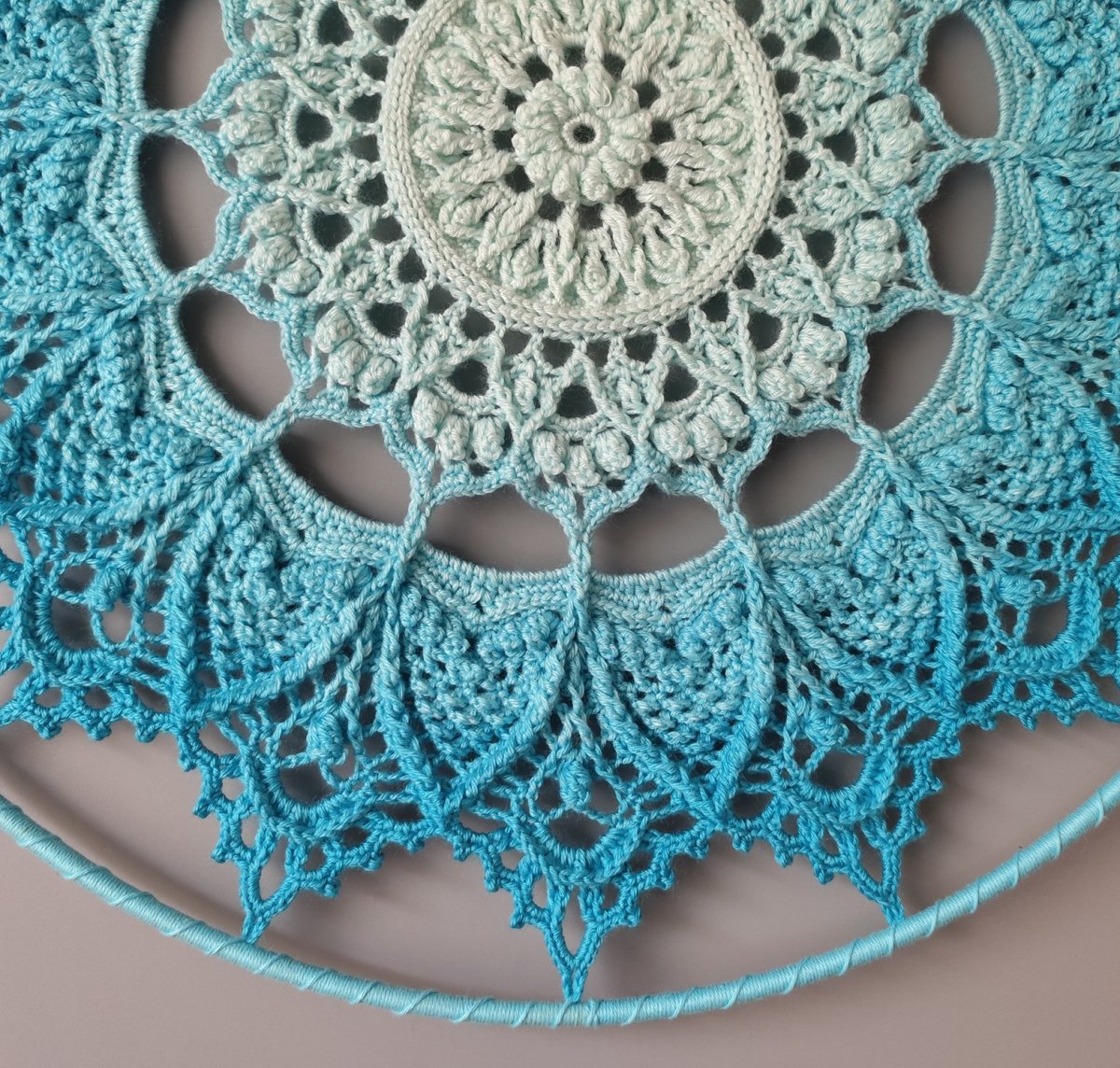 Háčkovaná reliéfní stínovaná mandala v modrých odstínech.