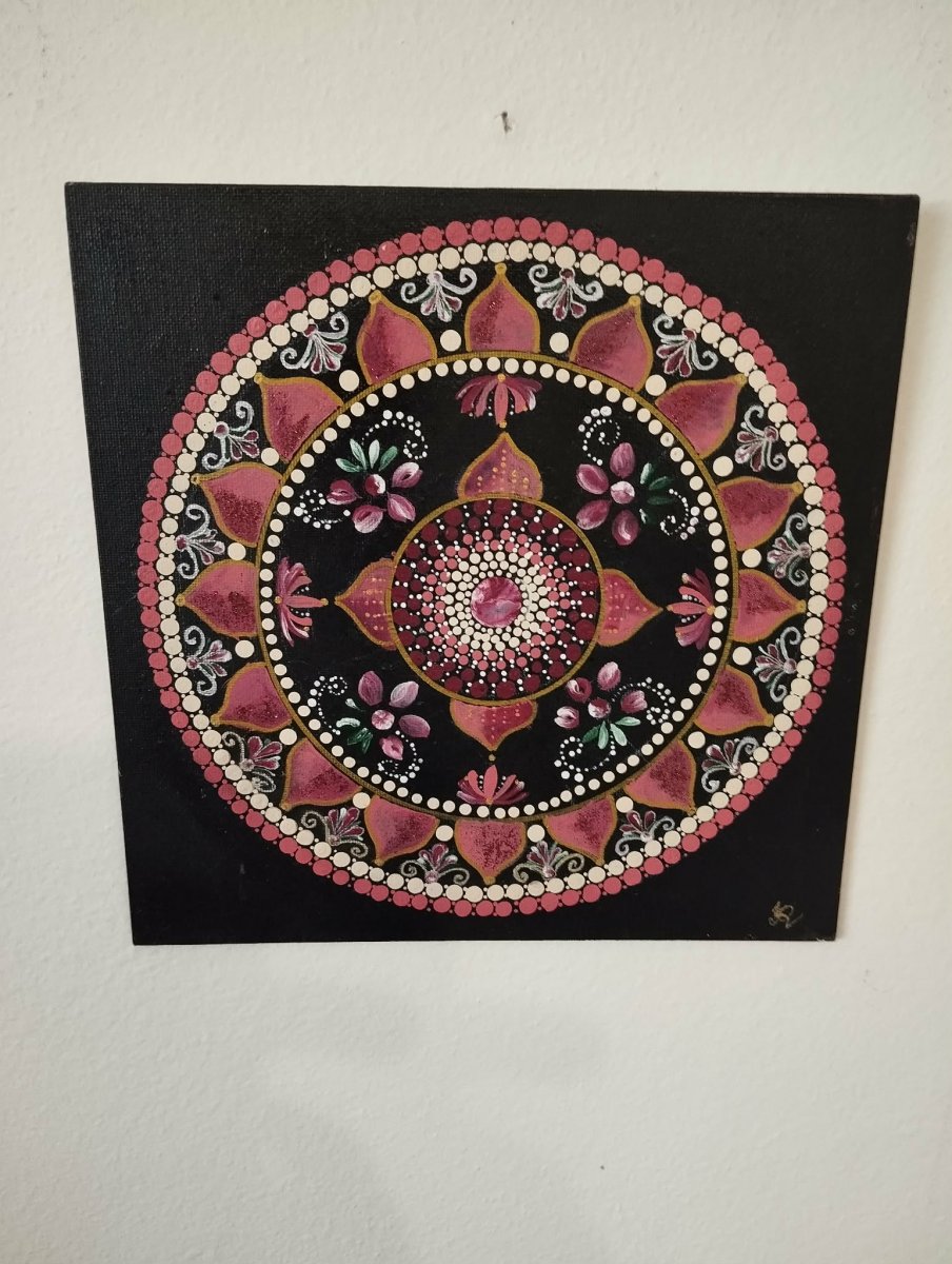 Tato mandala má černý podklad, který nechává vyniknout teplé růžové, bordó a krémové tóny, doplněné zlatými konturami a jemnými zelenými akcenty. Uprostřed je soustředný kruh z teček, který přechází z tmavě bordó přes růžovou do krémové jako jádro rozkvétajícího květu. Okolo něj jsou čtyři větší růžové okvětní lístky s jemným stínováním, mezi nimi menší květinové motivy s pěti okvětními lístky . Vnější prstenec tvoří řada větších růžových lístků se zlatým lemem, střídající se s drobnými ornamenty. Celý kruh uzavírá dvojitý okraj z teček (krémová a růžová). Působí jemně, žensky a vyrovnaně, s důrazem na symetrii a detail. Celkově z ní cít klid, láskyplnost a tichou radost.
