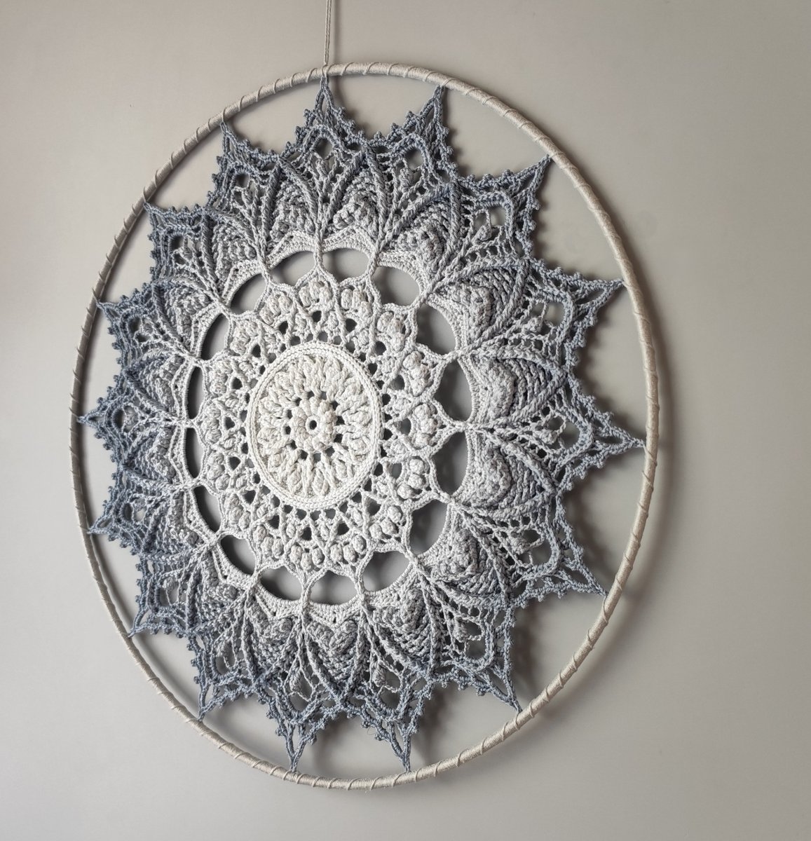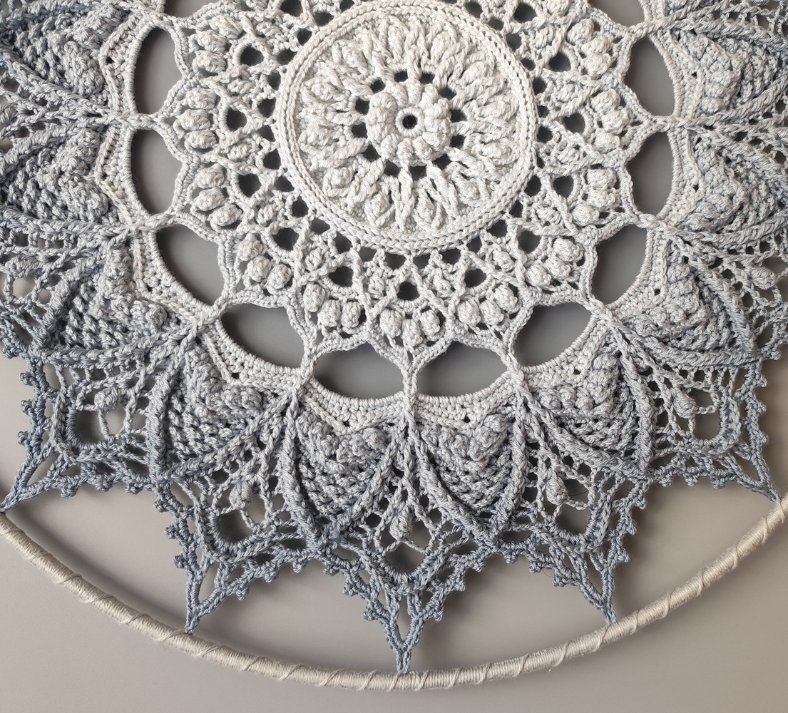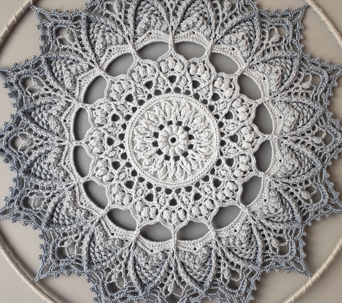 Háčkovaná reliéfní stínovaná mandala v šedých odstínech.