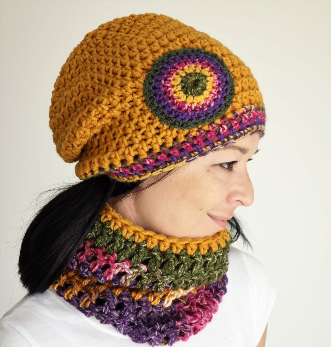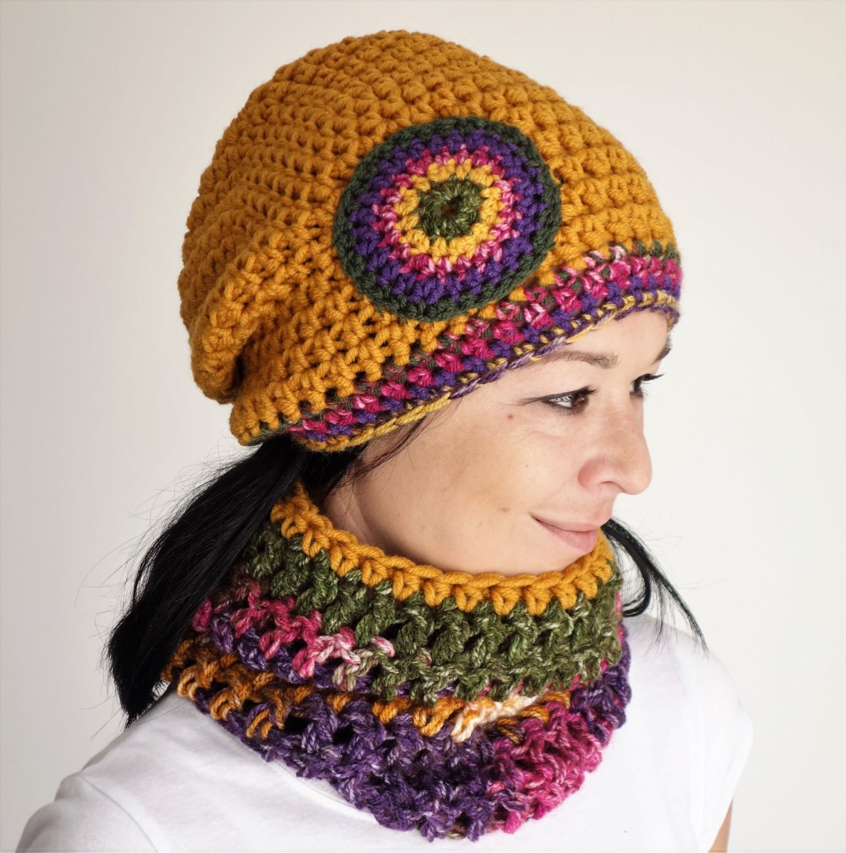 Skladá sa z horčicovožltej čiapky ozdobenej háčkovanou mandalkou a tunelového nákrčníka na jedno prevlečenie, ktorého farbičky melírujú od horčicovej, cez ružovofialovú až po odtiene zelenej.
