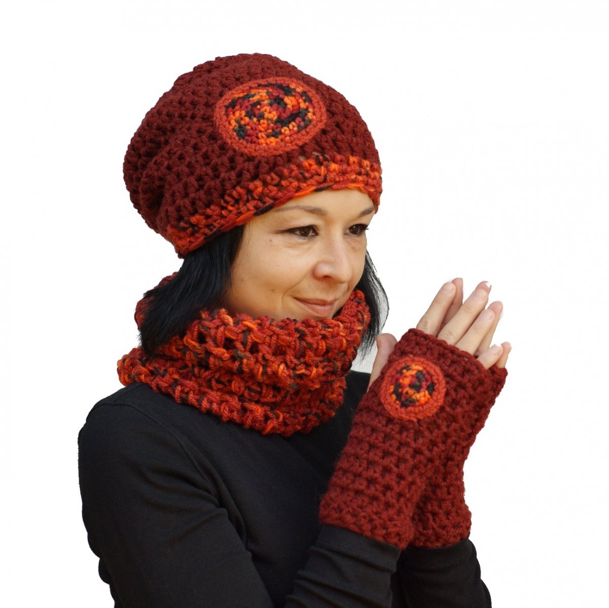 Skladá sa z čiapky a rukavíc škoricovej farby s hnedo-oranžovými aplikáciami a pestrofarebného nákrčníka ladeného tiež do hnedo-oranžova.