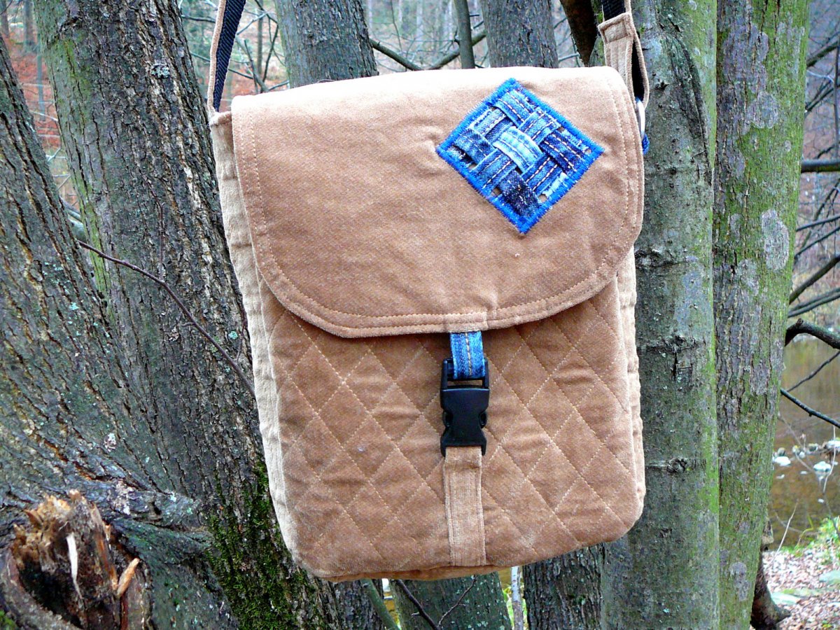 Kabelka přes rameno. Vyrobená z manšestrové tkaniny, dobře drží tvar díky duplikačním materiálům a prošívání. Klopu zdobí aplikace z rifloviny. 2 kapsy uvnitř.