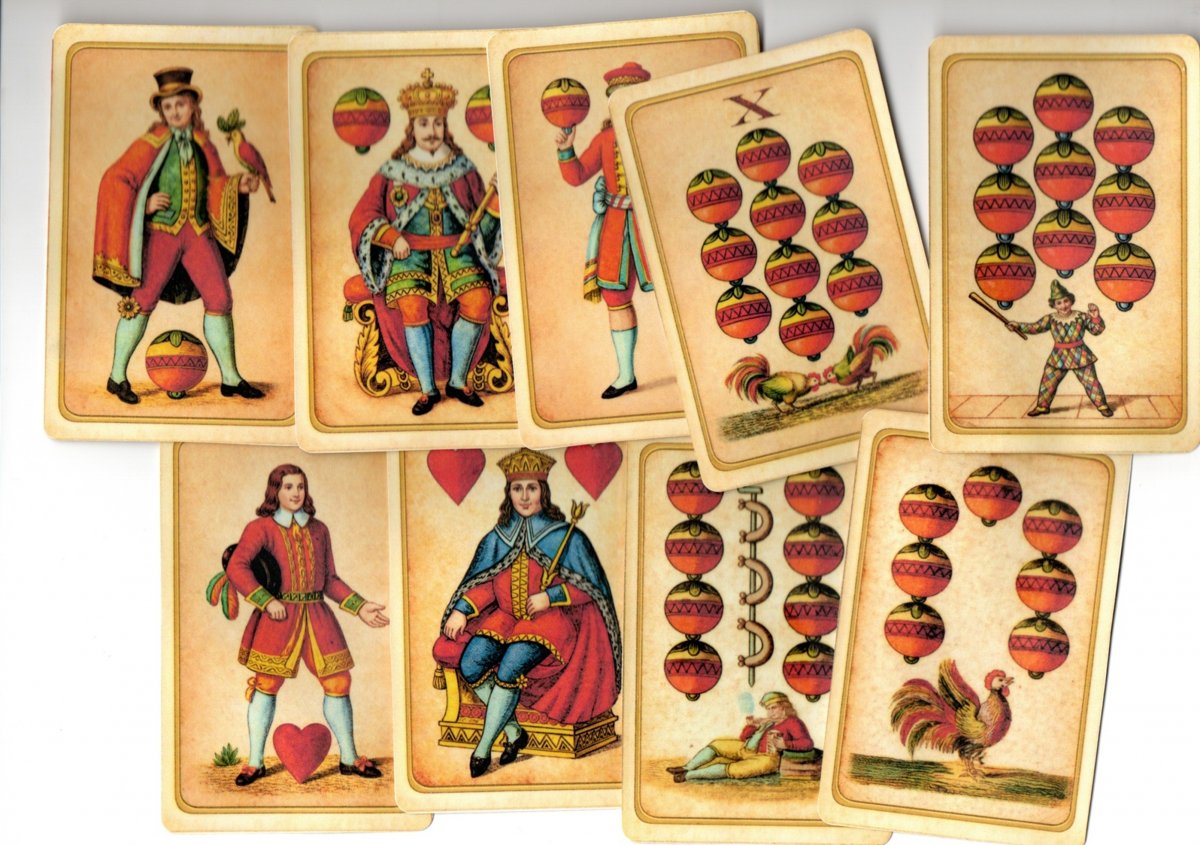 reprint mariášové karty také jako vykládací 32ks karet upravené AI vydáváno Norimberg vel: 10,5x6,8cm ruční práce tisk na papír 250g, přelakováno nezávadným lakem pro pevnost a lesk .