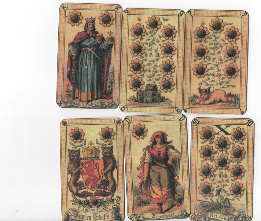 Mariášové karty také jako vykládací ,faksimile starých tisků z roku 1883 z Lipska . vel:9,5/5,5cm 32kusů značky žaludy listy břečtanu,ředkev, slunečnice, tisk na papír 250g přelakováno tvrzeno , ruční práce
