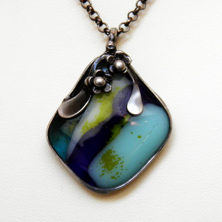 Přívěsek z pocínované mědi s originálním skleněným kabošonem vlastní výroby je zavěšený na řetízku dlouhém 46 cm. Na požádání lze zavěsit na kožený řemínek nebo černou saténovou šňůrku. Velikost přívěsku 4 x 3 cm. Je patinován, leštěn a ošetřen antioxidantem. Fusingové kabošony jsou vzhledem k technice výroby neopakovatelný originál, který zaručuje, že stejný šperk nikdy nepotkáte.