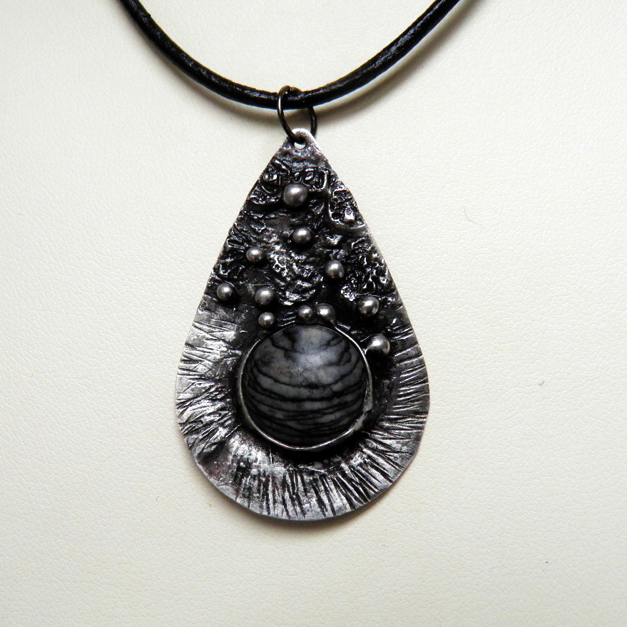 Náhrdelník s cínovaným přívěskem ve tvaru slzy. Do cínu je zasazený kabošon písmenkového jaspisu. Přívěsek je velký 4,5 x 3 cm a je zavěšený na kožený řemínek, dlouhý 46 cm - lze upravit, nebo vyměnit za řetízek. Patinováno, leštěno a ošetřeno antioxidantem. Lze doplnit náušnicemi Marty.