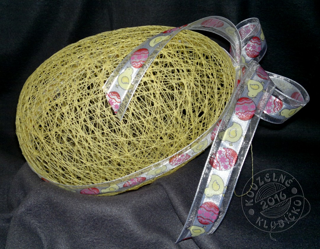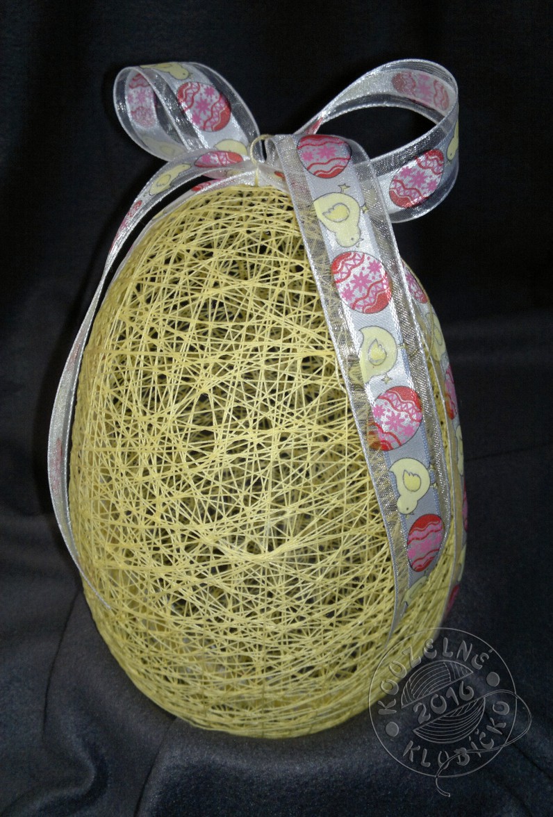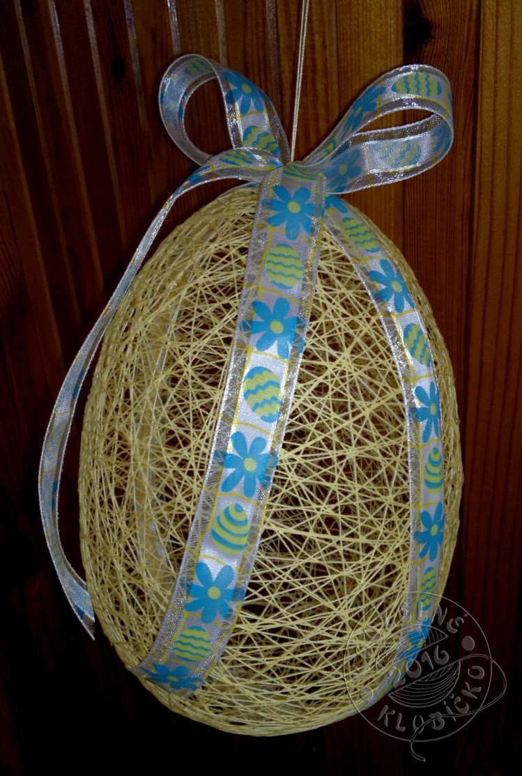 Maxi vajíčko motané z bavlnek v barvě světle žluté, natužené škrobem, zdobené mašličkou s velikonočním motivem, opatřené poutkem na zavěšení.