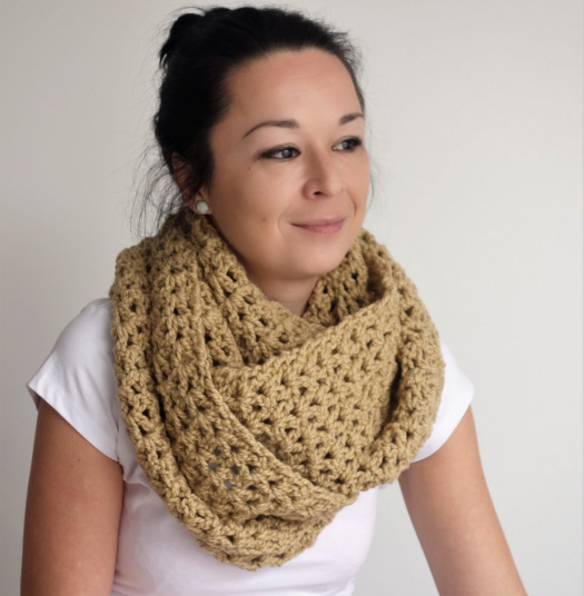 Veľký háčkovaný nákrčník béžovej farby.Uháčkovaný z príjemnej akrylovej priadze.Veľký, maxi, na dve až tri omotaniaMôžete zladiť s čiapkou a rukavicami rovnakej farby