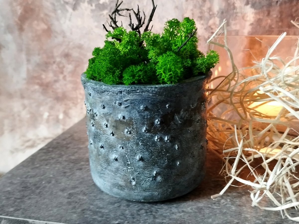 Je odlitý z ručně vyrobené formy, penetrovaný, vyplněný isladským sobím mechem a sušenou větvičkou ozdobného stromku.