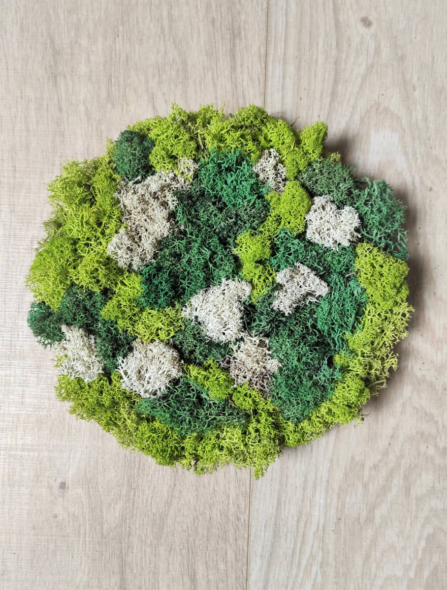Mechový kruhový obrázek na zavěšení na zeď o průměru cca 21 cm. Obrázek je zhotoven na malířském plátně nataženém na dřevěném rámečku a je tvořen ze 3 druhů sobího lišejníku.