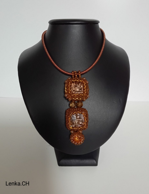 Originální náhrdelník „Medové čtverečky" je elegantní autorský šperk v hnědozlaté barevné paletě s jemným medovým tónem. Ústřední motiv tvoří dva geometrické čtverce a třpytivý Swarovski Rivoli, precizně obšitý korálkovým peyot stehem. Přívěsek je zavěšen na kulaté textilní bižuterní šňůrce v odstínu hnědé, která podtrhuje teplý charakter šperku.