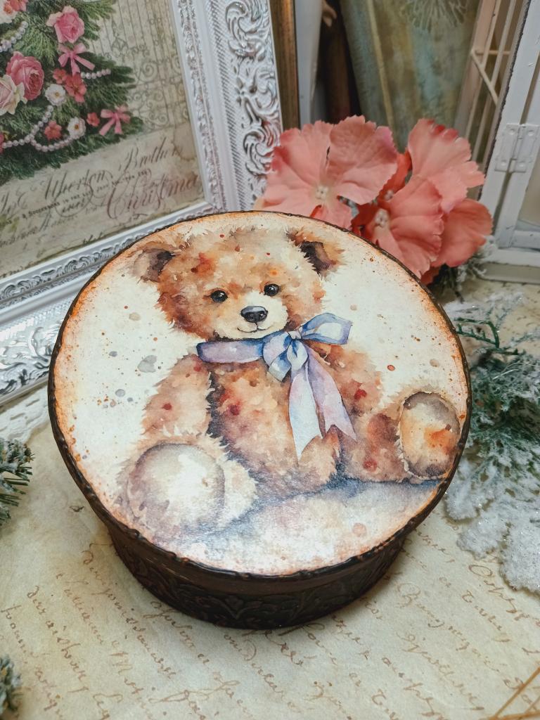 Kulatá krabička z tvrdého kartonu s motivem plyšového medvídka. Krabička je bohatě zdobená šablonovanými vzory a patinovaná.