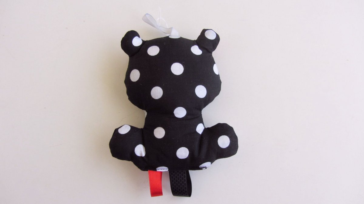 Šité hračka medvídka s chrastítkem. Medvídek je ušitý z bavlněné látky s atestem do tří let věku. V těle má chrastítko, které při pohybu vydává zvuk. Zvířátko je vyplněné PES kuličkami, které jsou hypoalergenní. Obě hračky mají plastové kousátko. Velikost medvídka je 13 cm.