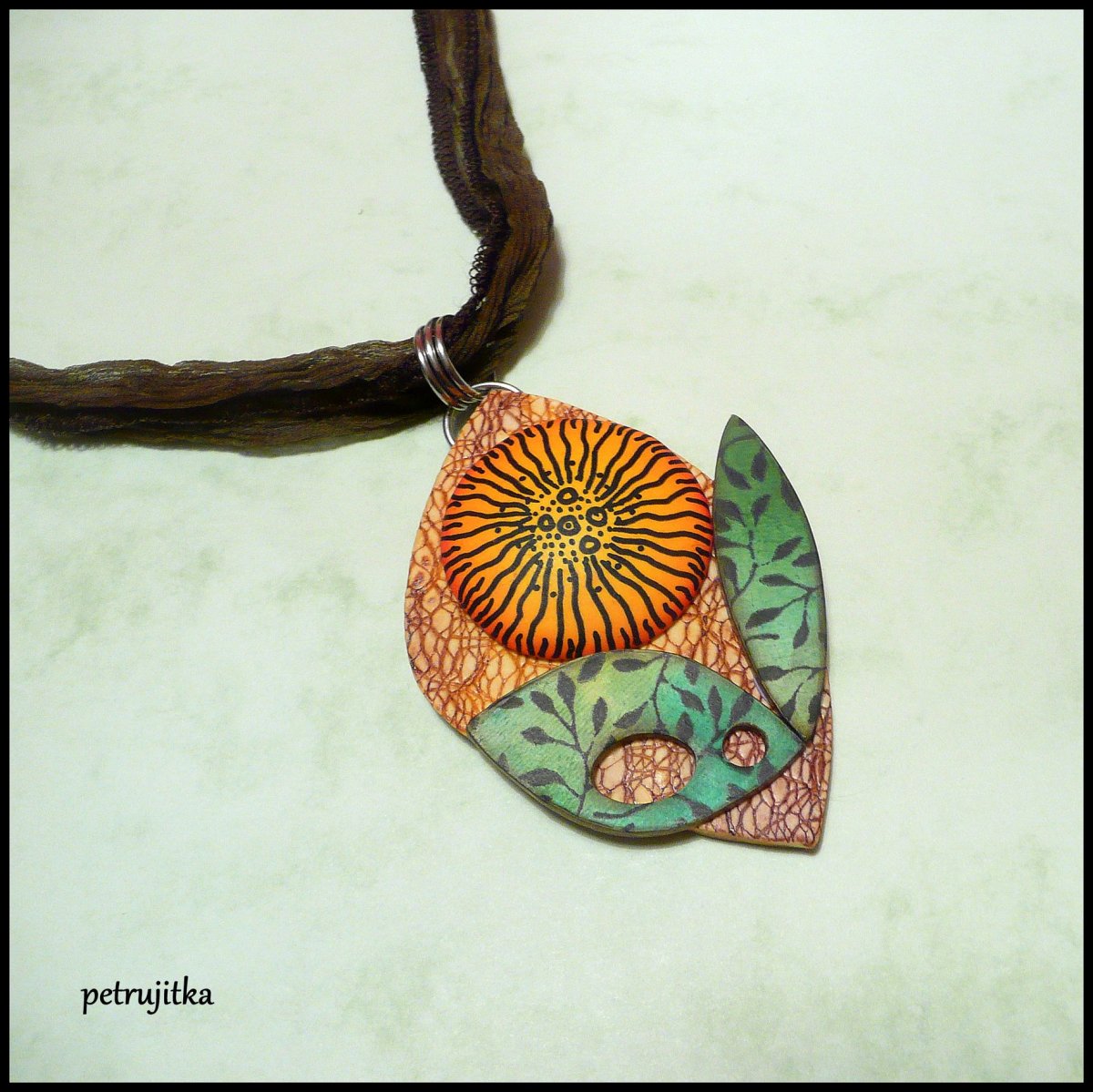 Originální dámský náhrdelník s přívěskem z polymerové hmoty. Barva je hnědá,
