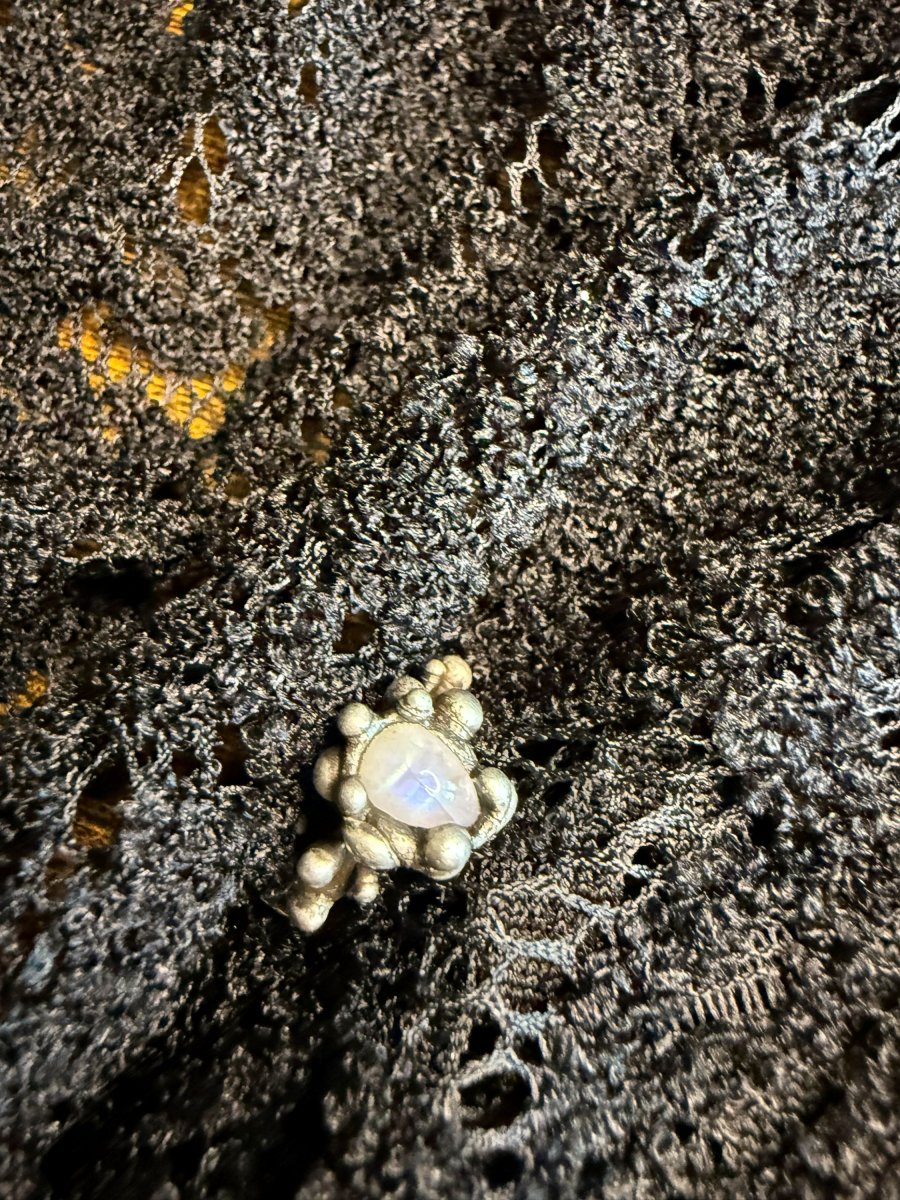 Jemný prstýnek s MĚSÍČNÍM KAMENEM se spoustou cínových detilů a kuliček.