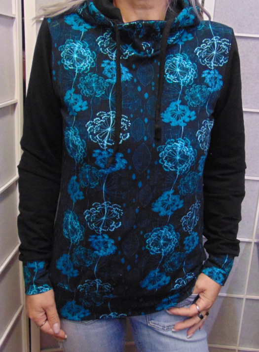 Střih je mírně projmutý v pase do lemu, kapuce je vypodšívkovaná.