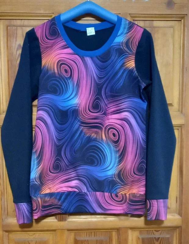 Střih je mírně projmutý, vsazený dlouhý rukáv, v pase do lemu.