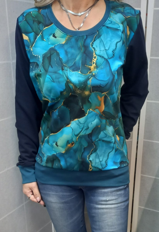 Střih je mírně projmutý, vsazený dlouhý rukáv, v pase do lemu.