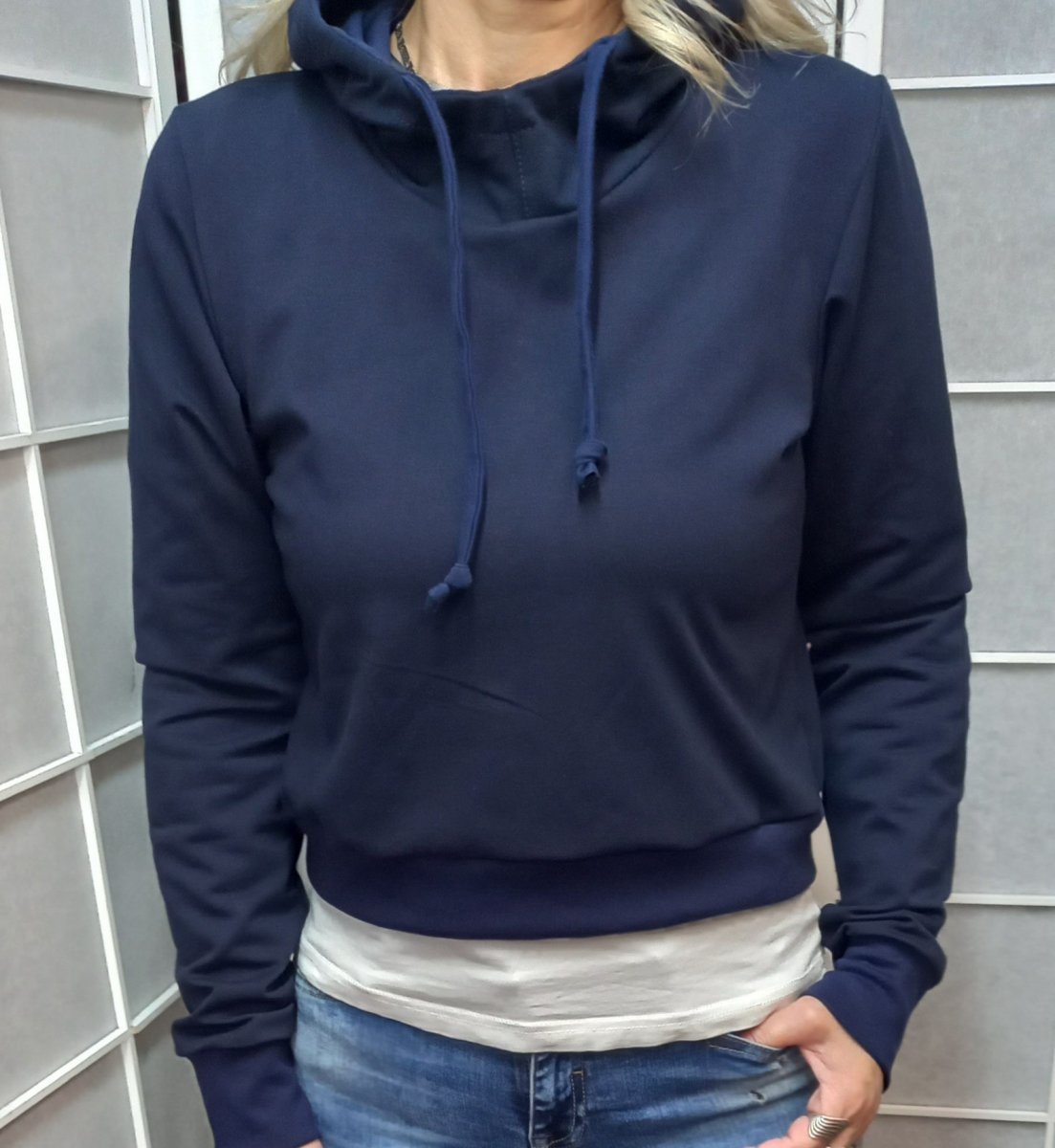 Střih je mírně projmutý v pase do lemu, kapuce je vypodšívkovaná.