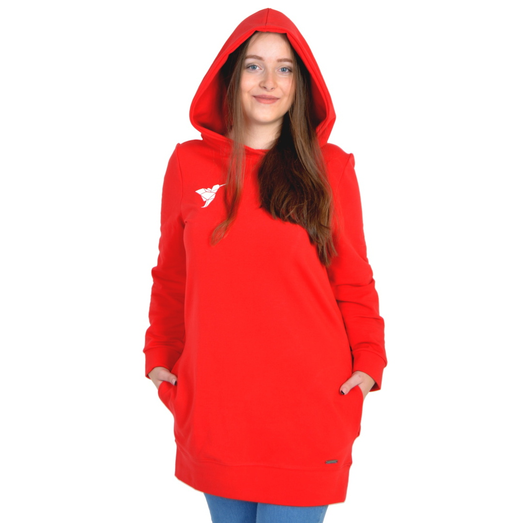 Praktická a originální delší mikina s kapucí je ušita z příjemné nepočesané bavlněné teplákoviny vyšší gramáže v krásné červené barvě.