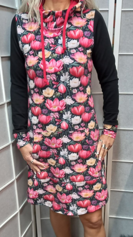 Pohodlný střih, v pase mírně projmutý, na předním díle našitá klokaní kapsa, vypodšívkovaná kapuce se šnůrkou. PD i ZD do kulata.