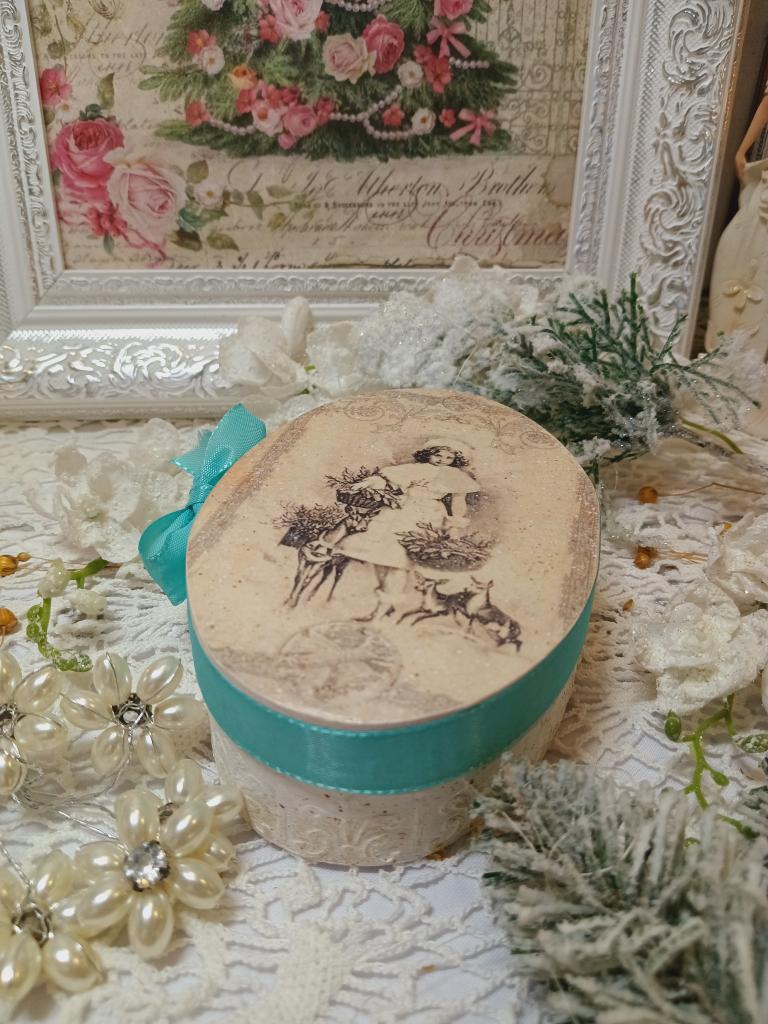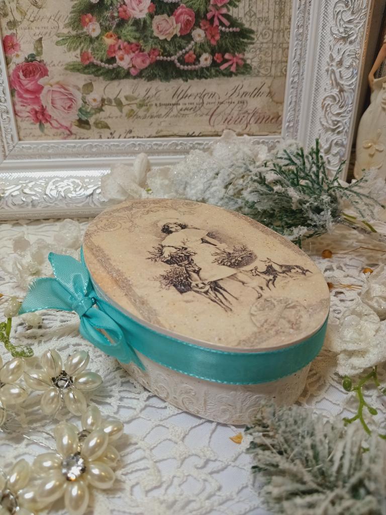 Oválná dřevěná krabička s motivem ženy, která jde ve sněhu a nese v košících chvojí, okolo ní jdou zvířátka. Kolem obrázku jsou filigrány a víko krabičky je ozdobené tyrkysovou stužkou. Vnitřní část víka je ozdobená andělíčkem. Spodní díl je reliéfně šablonovaný bordurou a lehce patinovaný.