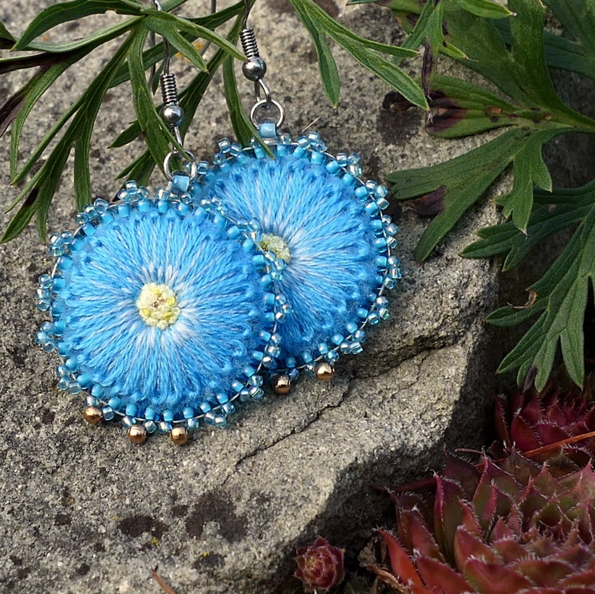 Ručně vyšívané náušničky průměru 3 cm, kvalitní vyšívací příze, otevřené háčky nerez. Včetně silikonových zarážek. Výšivka na filcu. Náušnice jsou lehounké. Uprostřed očka zlatá nitka.