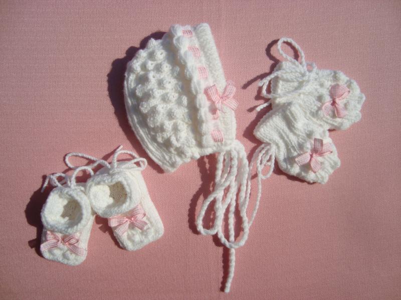 Sváteční pletená souprava pro miminka. 100% akryl + barevné stužky souprava obsahuje: kabátek - zapínání na zádech (knoflíčky) dupačky - zapínání na ramínkách a pro snadné přebalování i mezi nožičkama čepička, bačkůrky a nově i rukavičky (na přání zákazníků) Soupravička je vhodná pro miminka od narození do zhruba 3 - 4 měsíců. Moje vnučka se ve stejné vezla domů z porodnice. Kabátek je poměrně volný, takže stačí jen ohrnutí rukávků. Čepička je větší, počítá se s tím, že pro čerstvě narozené miminko je vhodnější pod pletenou čepičku dát ještě jednu a to z čisté bavlny. Jako materiál jsem volila 100% akryl, mám jistotu že nekouše. Výměnou barvy stužek je možno uplést i soupravu pro malou princezničku, nebo dát i bílou stužku pro sváteční události - třeba pro křest. Soupravu mohu uplést i jen bez dupaček, nebo bez rukaviček- cena pak bude úměrná k množstní dolňků. Myslím si, že tato soupravička je perfektní dárek do porodnice.
