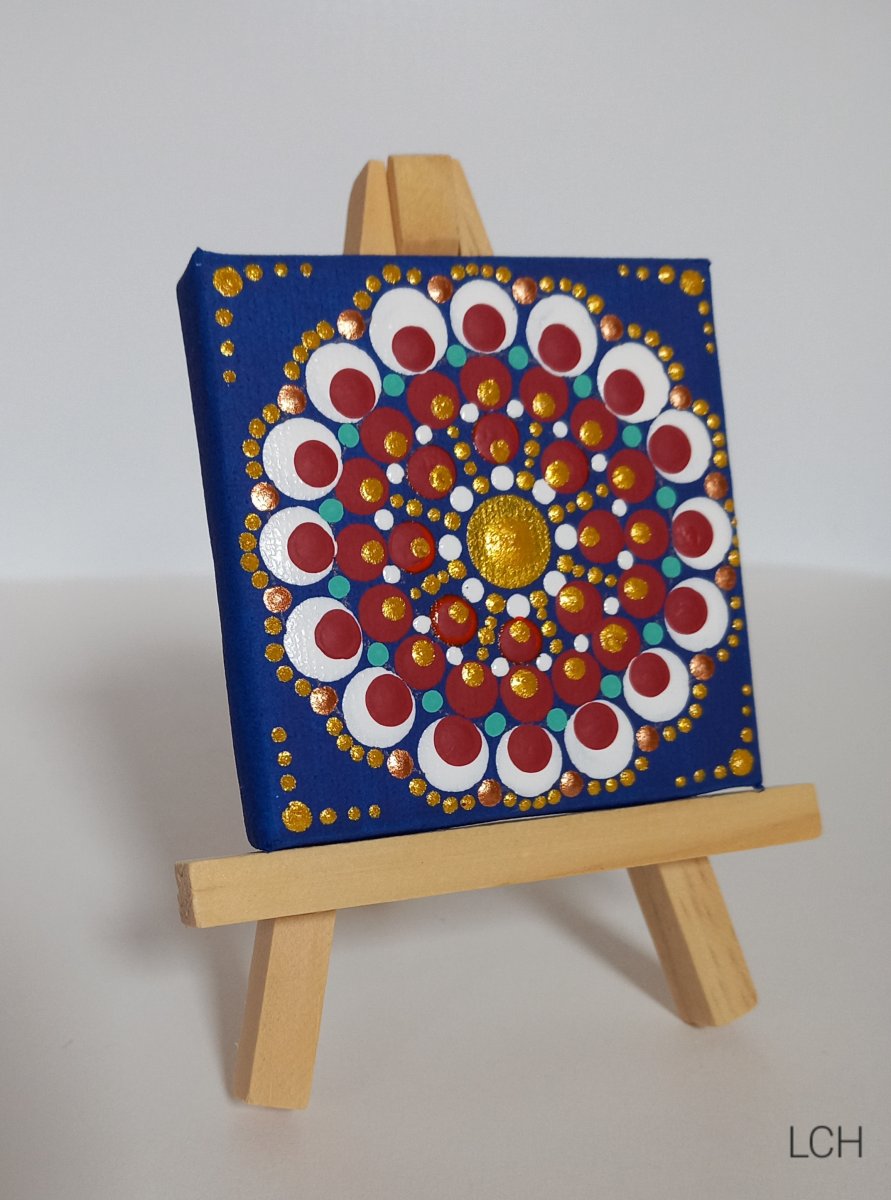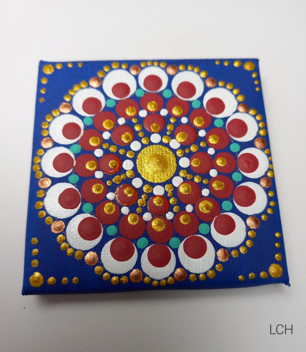 Mandala technikou DOT-ART neboli tečkování, vlastní návrh. Relaxační motiv. Akrylové a speciální barvy Pentart. Vhodné jako dárek.