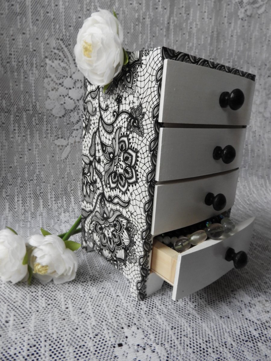 Dřevěná minikomodka v vzoru krajky v bíločerné kombinaci, 4 šuplíčky na šperky či jiné drobnosti.